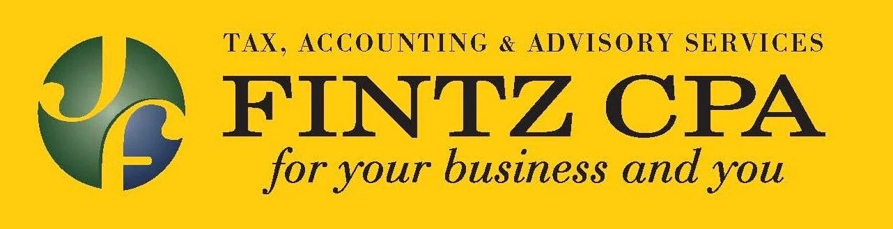 Yellow background with black and red text advertising tax, accounting, and advisory services by Fintz CPA, including the logo consisting of a green circle with yellow and blue elements.